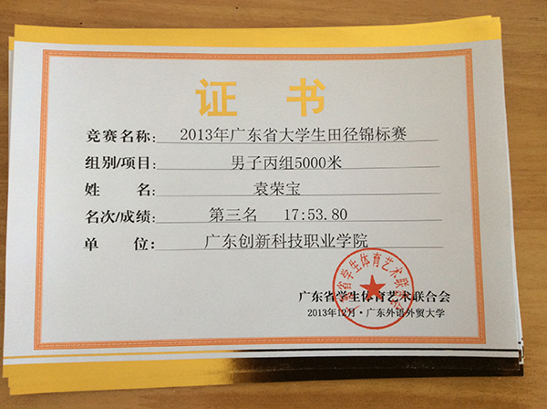 12月19日—22日,2013年广东省大学生田径锦标赛在广州市广东外语外贸大学举行。学院常务副院长李玉春、教练员朱甜、刘锋、董宁、方浩源、方嘉威、陈芍林等各位老师带领我院田径队运动员经过四天的顽强拼搏,获得了骄人成绩:袁荣宝同学获得男子丙组5000米第三名,何建明、郭钧瑜、邓杰文、许子军等同学分获男子丙组铅球第五名、女子丙组跳高第六名、男子丙组跳高和400米第七名的好成绩。